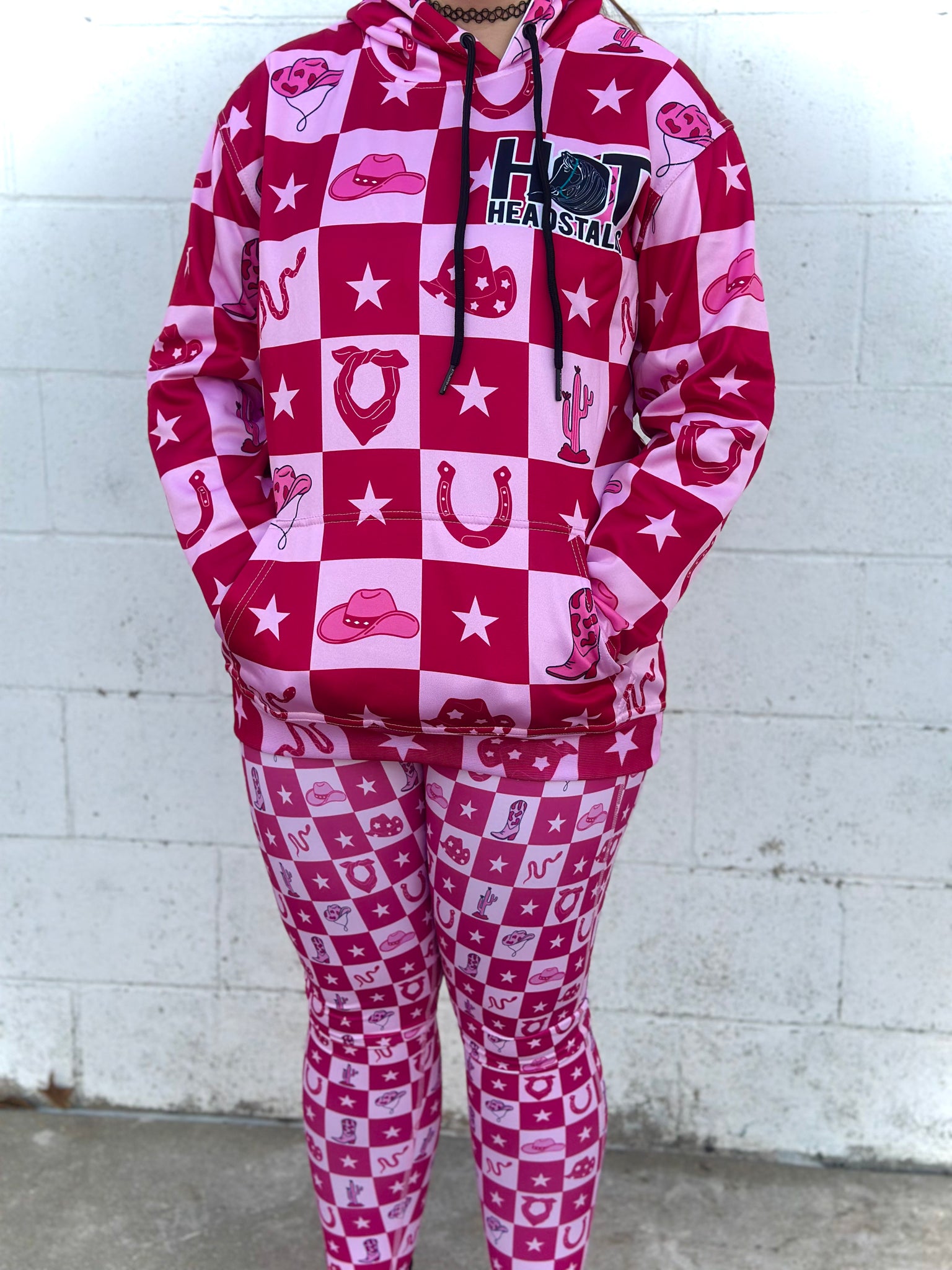 Hot Headstalls patterned yoga pants! Select the size/pattern in the drop down menu. Model in photos is 5ft 4 inches 165lbs wearing a size large. Size chart is in the photos! These are super stretchy with a snatched waist. Pockets on both legs. They are 73% polyester 27% spandex. No returns or exchanges on apparel.