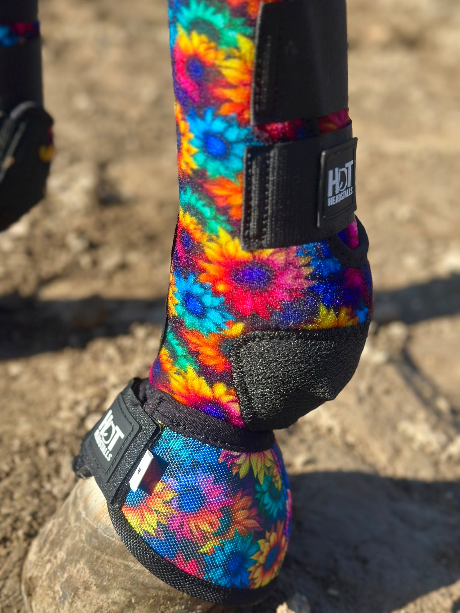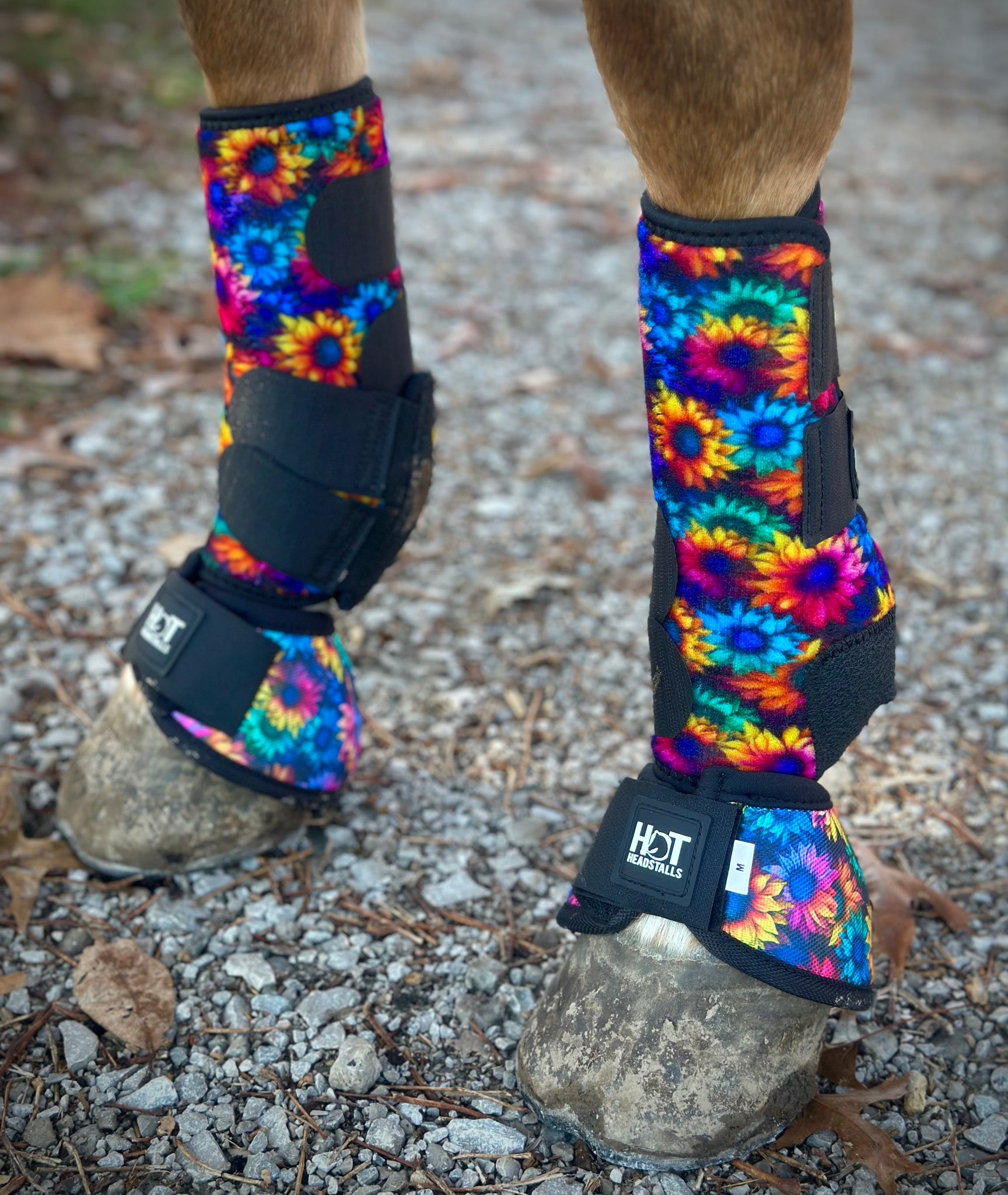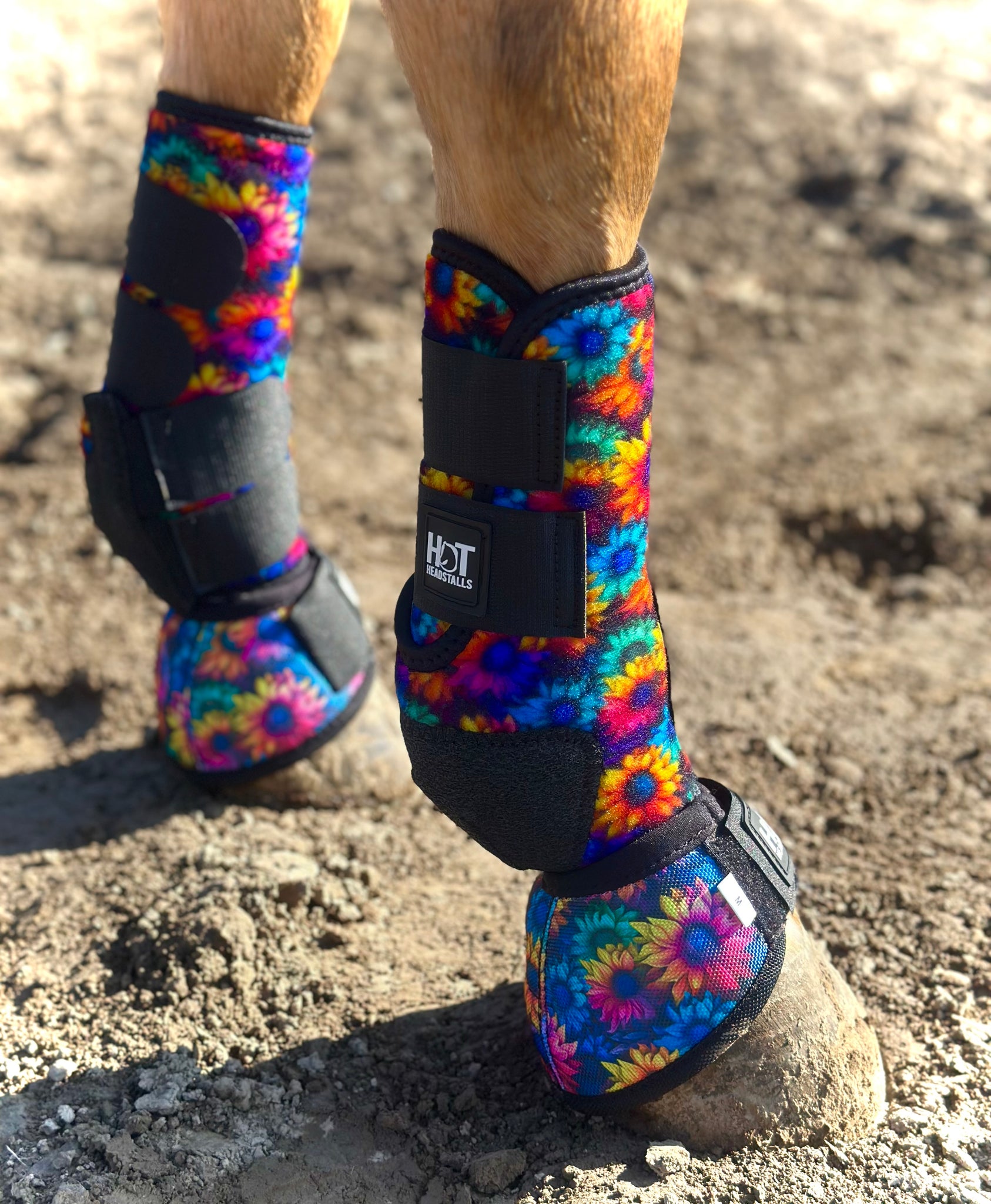 High quality horse sized sport boots with tons of support and protection for your horses legs. They have a tendon support piece inside as well (see picture on the listing) Super strong Velcro and 100% virgin 4 way stretch neoprene. We went to the best manufacturer for these. These are sold as pairs. Fronts or Hinds. Small, Medium, and Large. Bell boots to match SOLD SEPARATELY- available  via other listings on our website. These match our fun headstalls and other items.