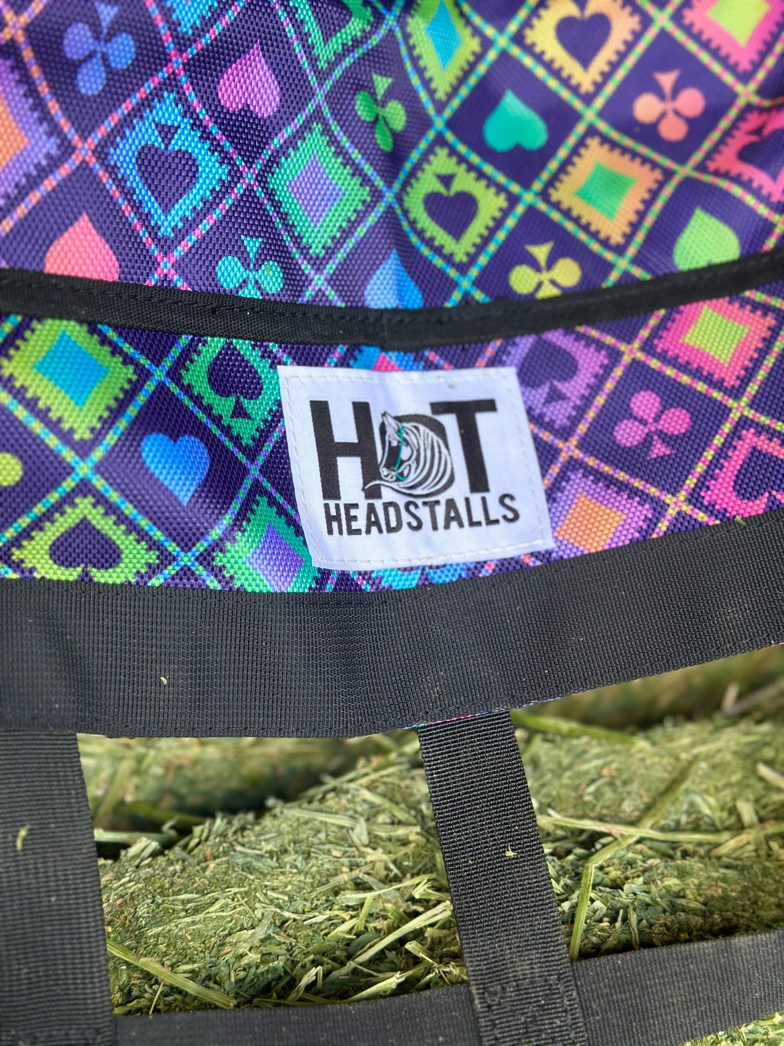 Our New and Improved Hay Bag! These Hay Bags feature strong box stitch sewn square hole openings. They velcro shut at the top. The Hay Bag is 24 Inches Across, 18 Inches Tall, and 9 Inches Deep. They feature an adjustable strap for hanging. These are instock and ready to ship.