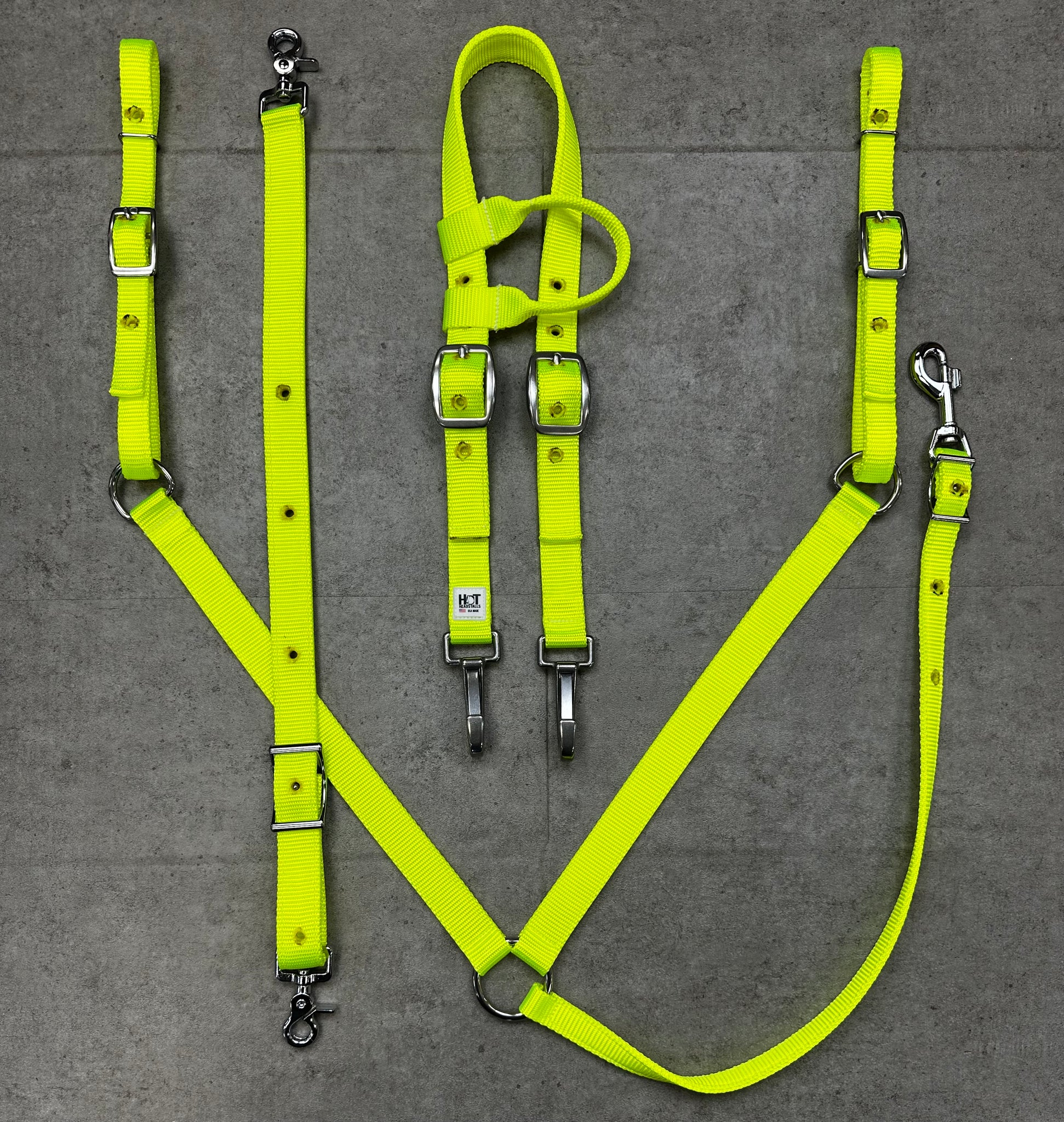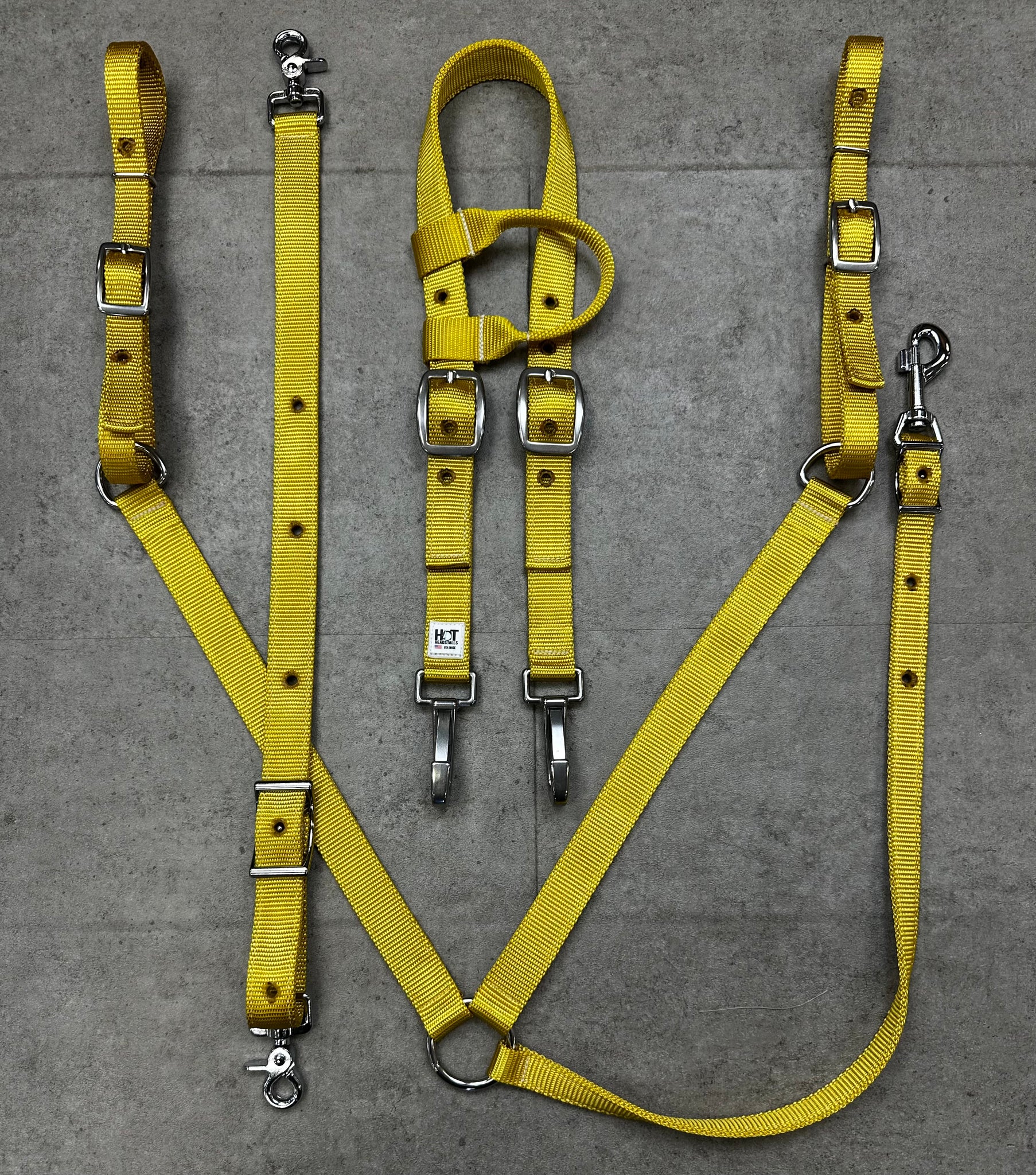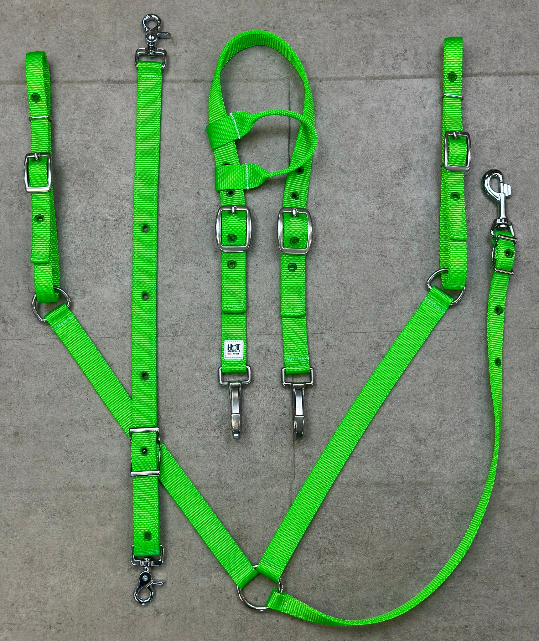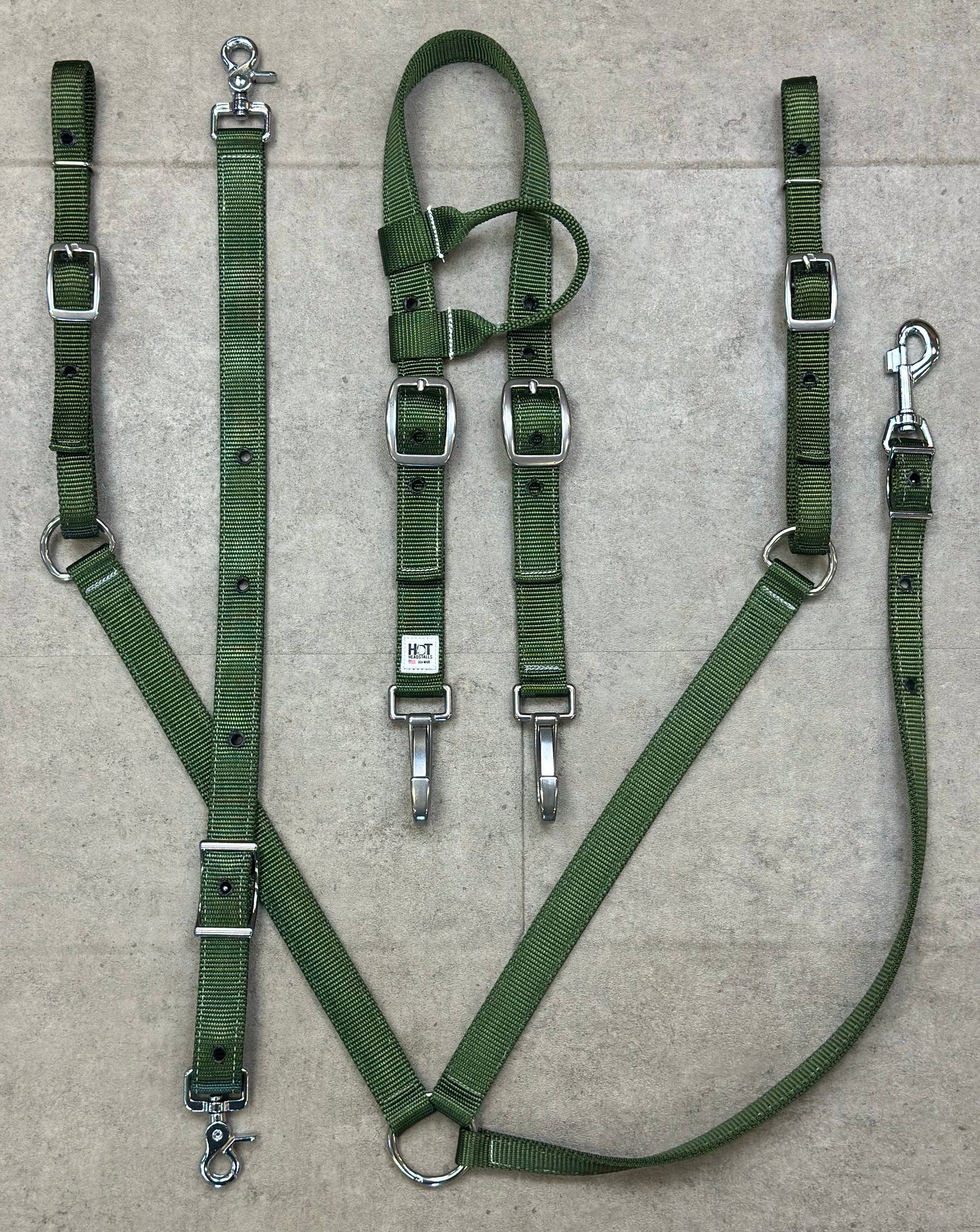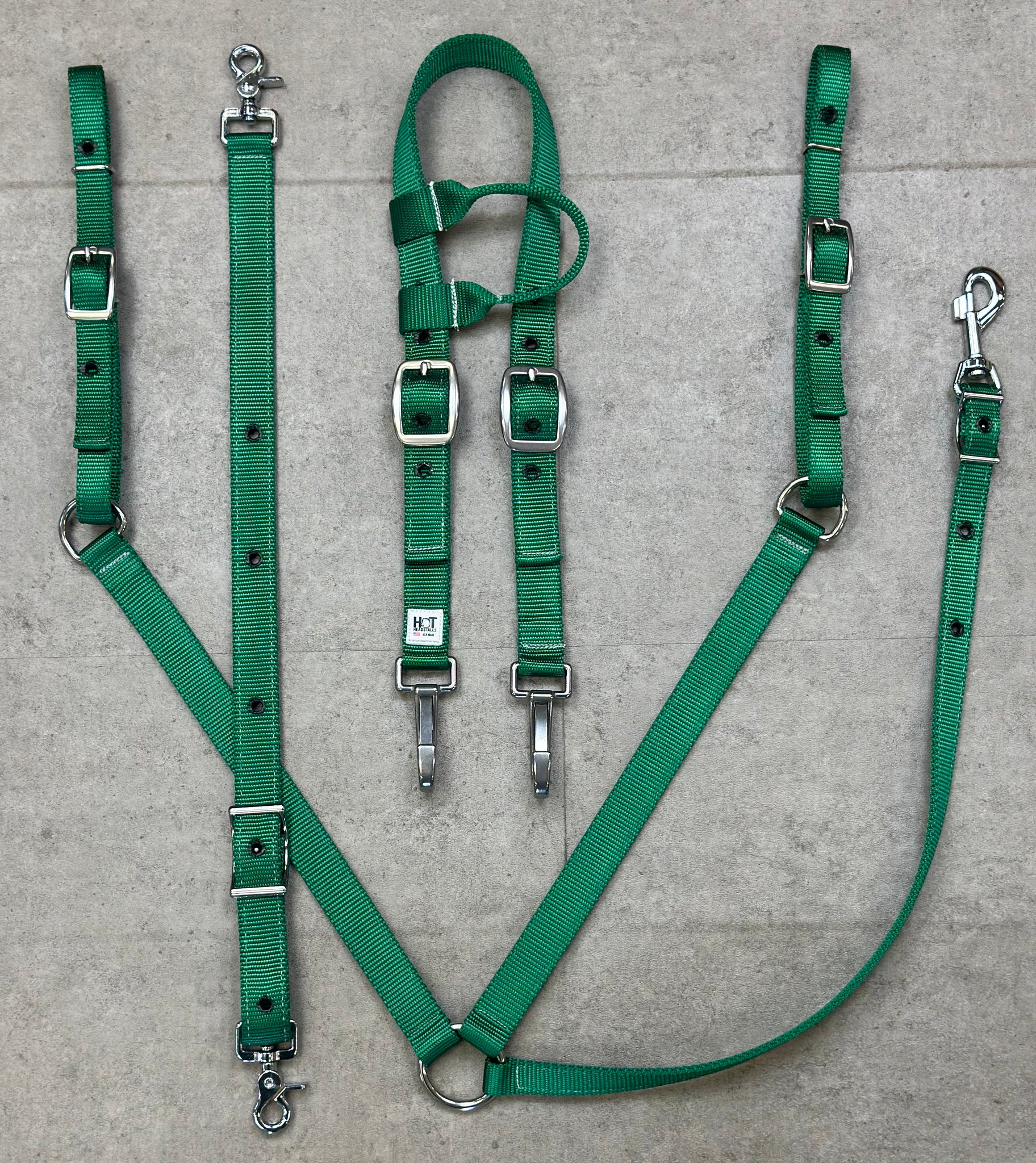 Instock Horse Size Solid Color USA Made Nylon Tack Sets! A set comes with a One Inch Wide Rolled Ear Headstall with heavy duty stainless steel buckles and spring snaps, a one inch wide stainless steel hardware breastcollar, and a double snap wither strap! Select the color option you want in the drop down menu. Other matching items, sizes, colors, and color/pattern combinations can be ordered in the custom folder on the front page of our website!