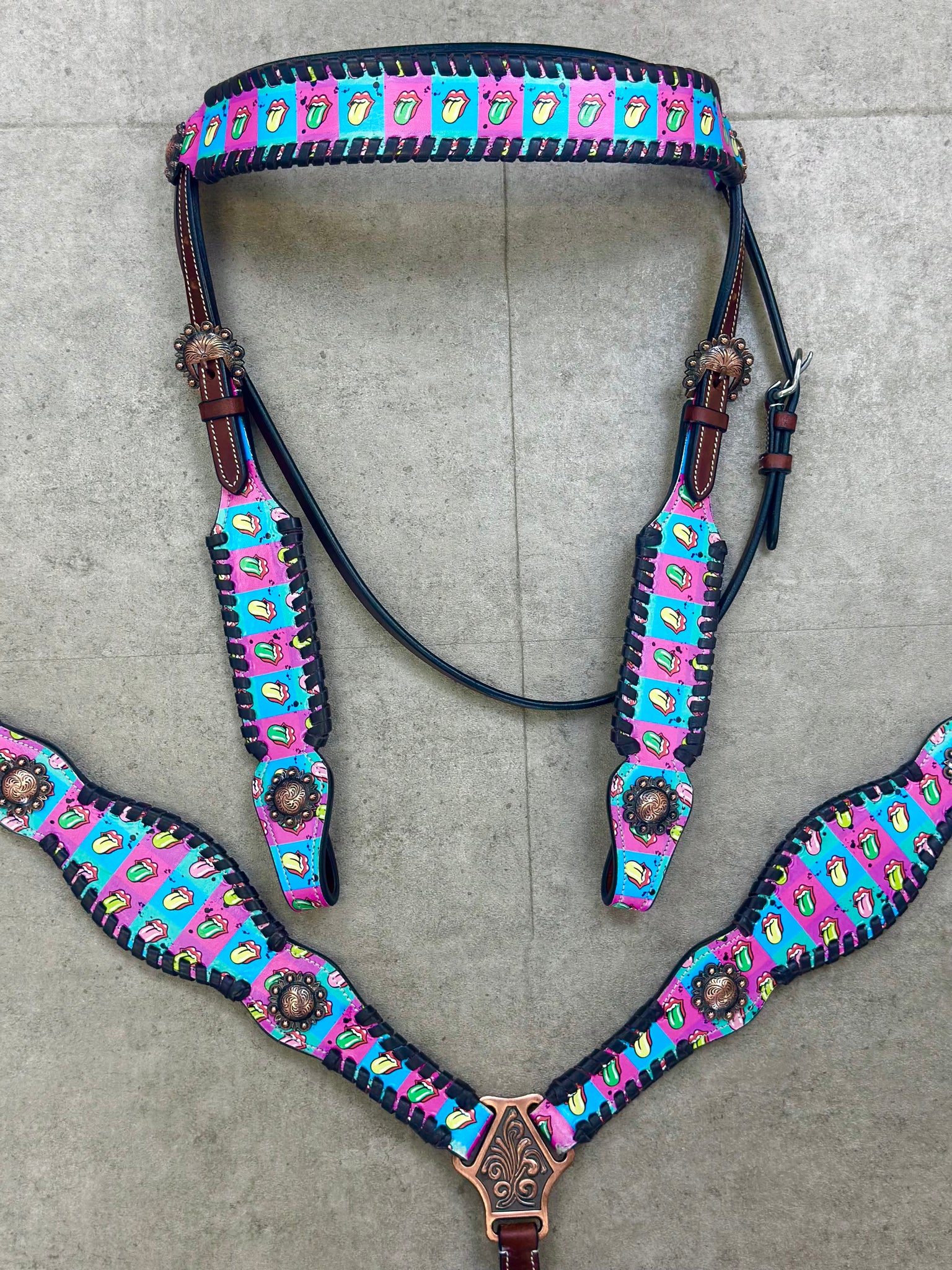 These are high quality printed leather tack sets and bronc halters. Select the items you want from the drop down menu. Only one batch in this pattern will be made. The Bronc Halters are average horse size with stainless steel hardware. The Leather Tack set comes with a headstall and Breastcollar. Horse size and very adjustable with room to poke more holes. Model in photos is my 14.2 hand cowhorse.