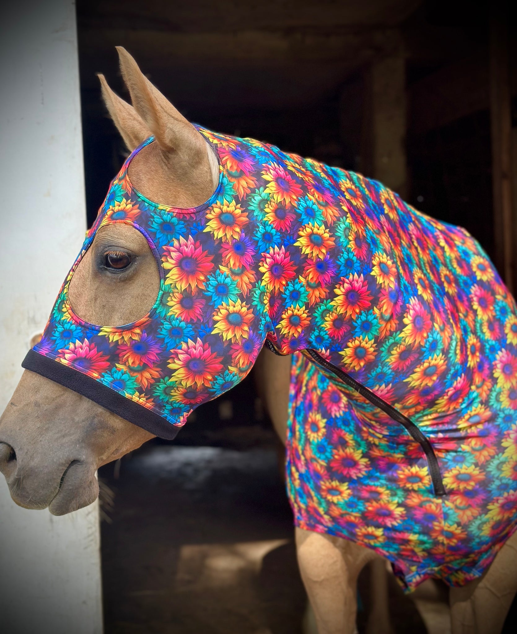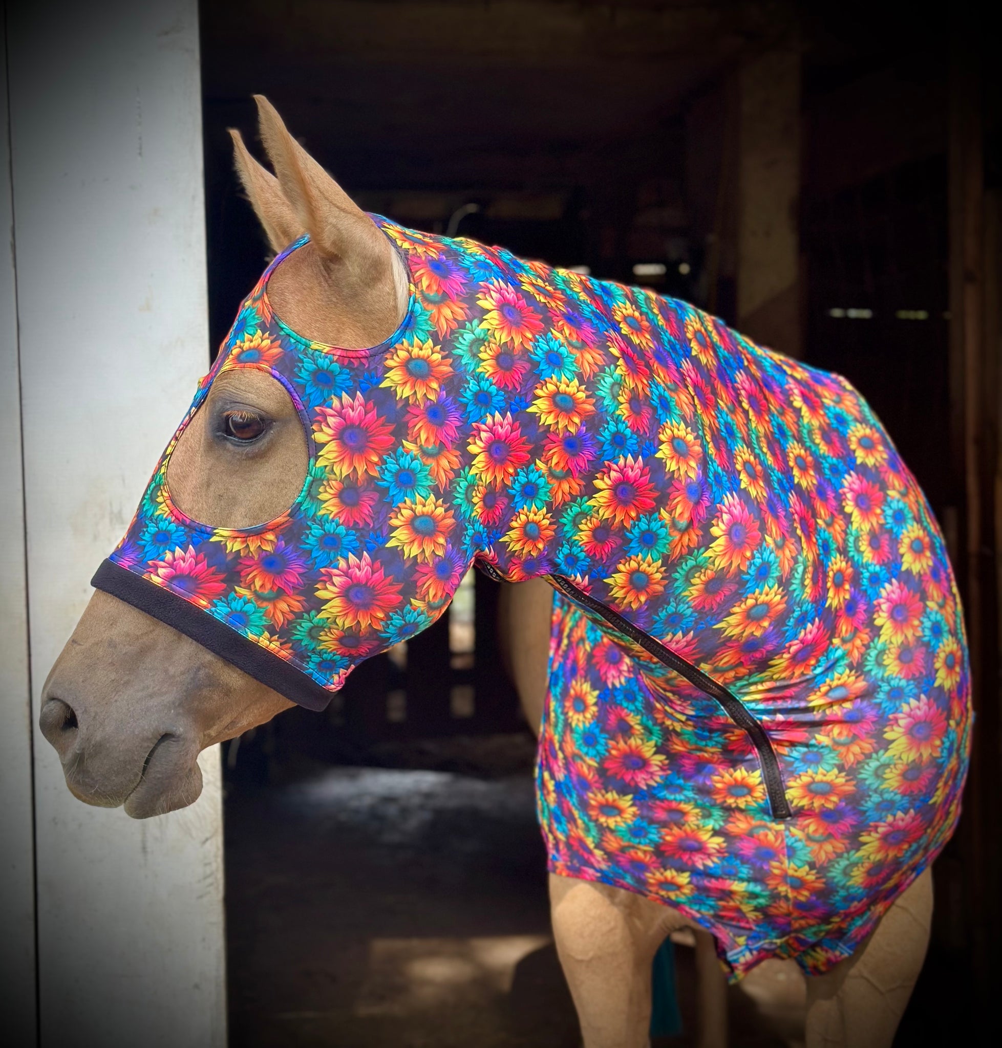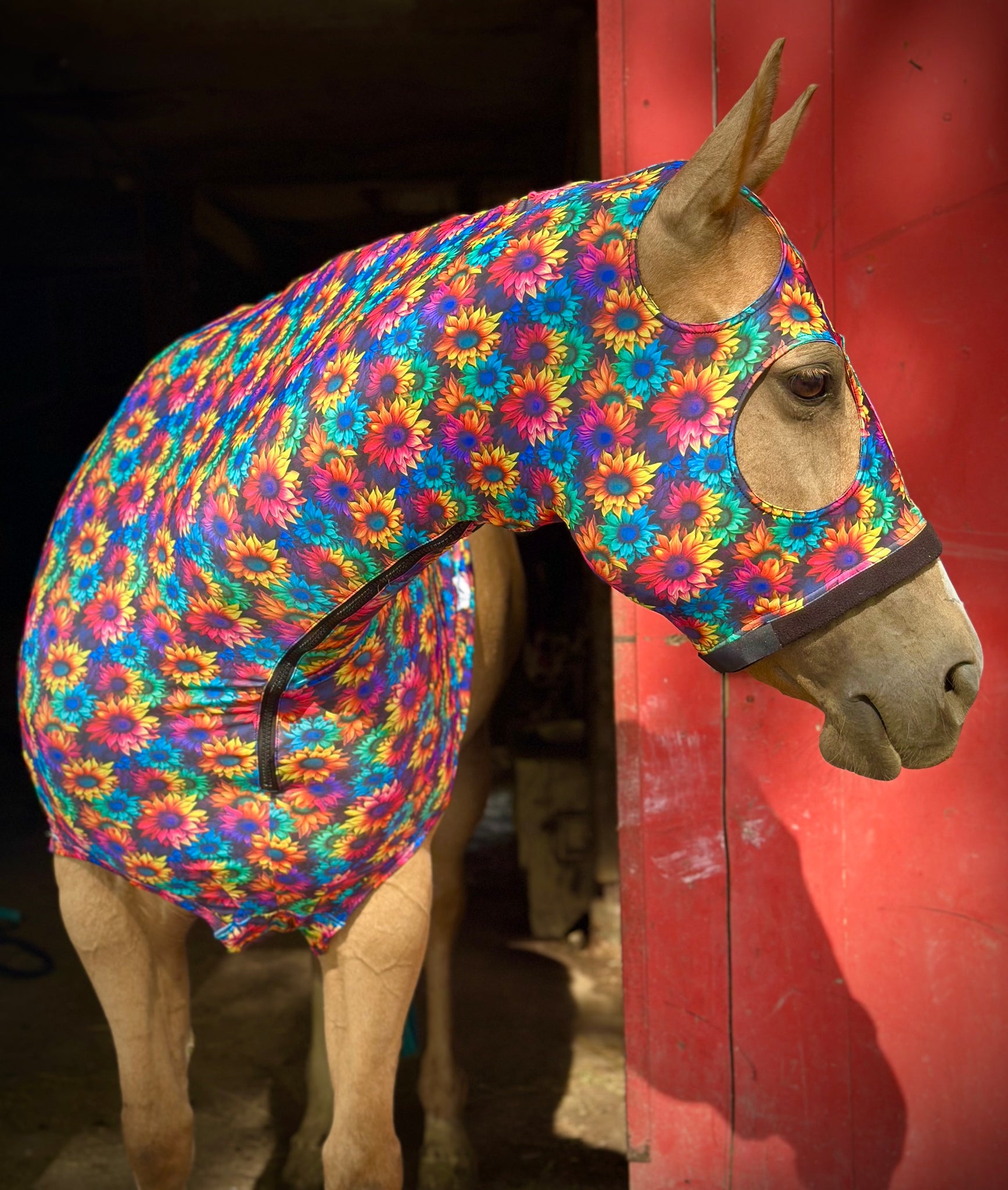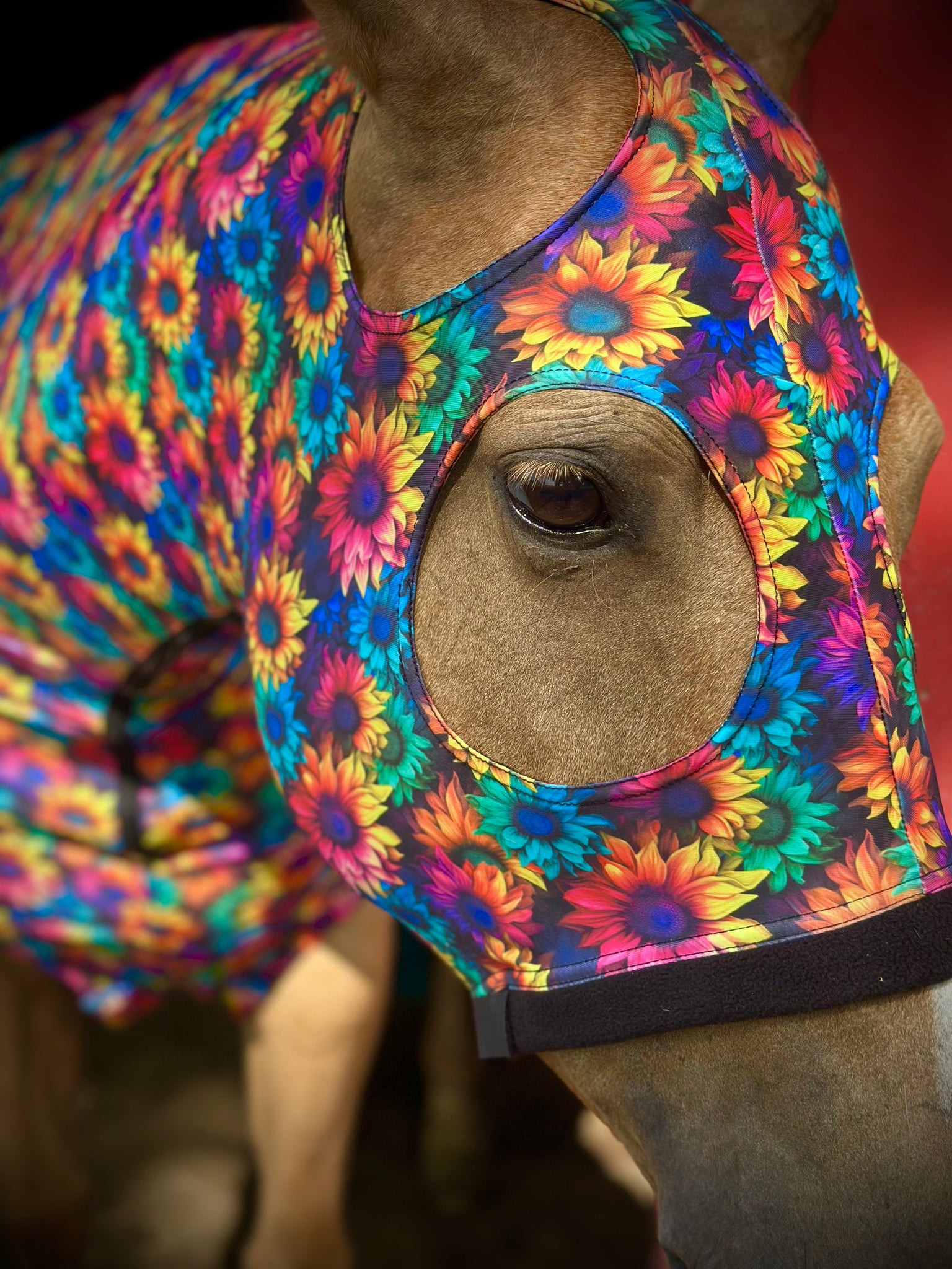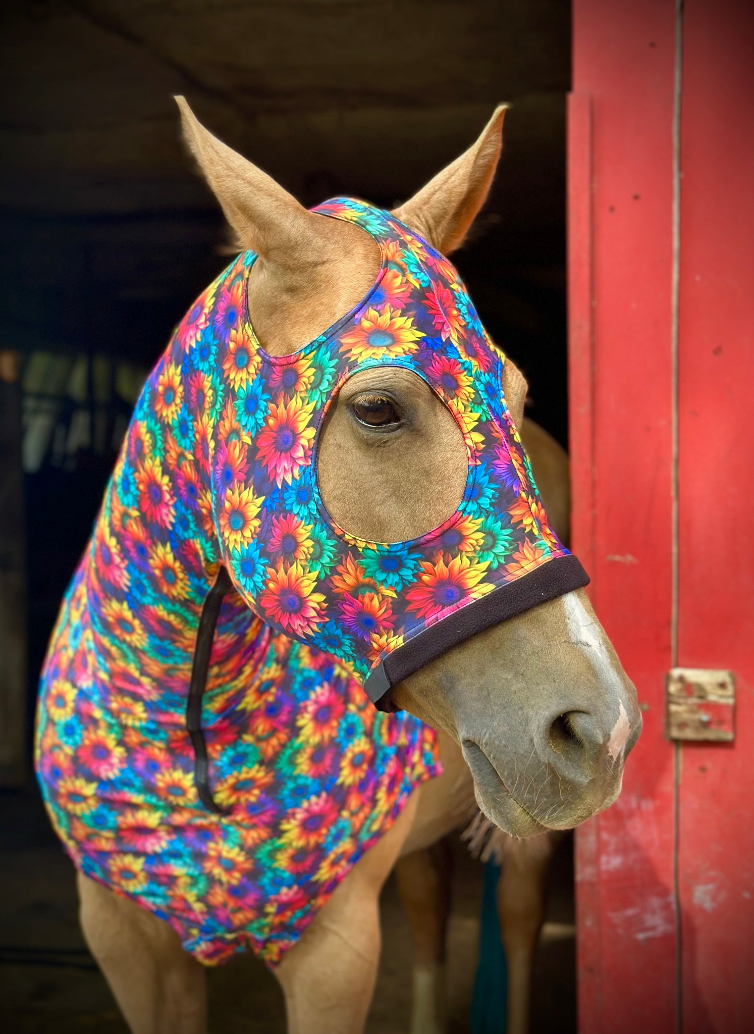 Hot Headstalls Lycra Hoods! These are made of high quality, soft and stretchy Lycra. Our hoods feature a fleece lined noseband, a zipper up the neck, and a buckle leg strap.